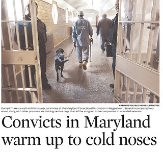 Prisoners at the Maryland Correctional Institution are putting their hard time to good use - training service dogs for wounded veterans. The Baltimore Sun says 24 Labrador Retrievers call the prison home for one year - where they live with inmates and work with trainers to learn 30 commands. Prison officials say inmates make the best trainers, since they have something most people don’t: unlimited time.
