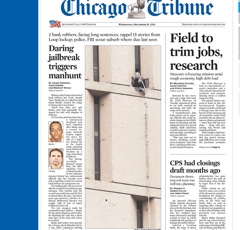 A daring jailbreak in Chicago has prompted a manhunt, reports the Tribune this morning. Taking a cue from every teenager who has ever snuck out of their room, the two convicted bank robbers used tied-together bed sheets to shimmy down the side of the 27-story prison facility in downtown Chicago (see photo). Guards inside found mounds of clothes in the prisoners’ beds, shaped to look like they were both asleep.