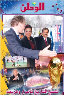 Above is the front page of Qatar-based newspaper Al Watan. I don’t read Arabic, so I’m not sure what the copy says, but I’m assuming it’s something to do with World Cup giddiness. Below is the inside story from Al Watan: