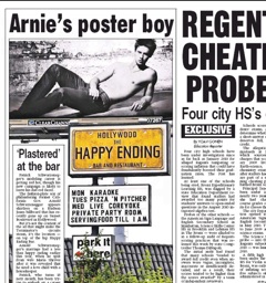 A billboard of Patrick Schwarzenegger was recently erected high above a California bar says the New York Post. But his dad’s probably not happy about the placement. Given the recent romantic wreckage in the Governator’s life, we assume he doesn’t appreciate the “Happy Endings” sign directly below his son’s portrait.