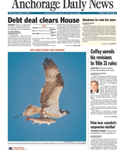 The photo on the front page of the Anchorage Daily News this morning looks a scene from someone’s wall. But it’s actually an action shot. Someone was quick enough to snap a photo of an osprey snatching a Dolly Varden trout from a local creek.