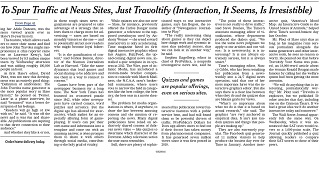 Quizzes and games are becoming a huge draw for news websites. The New York Times says Time Magazine’s recent How much time do you spend on Facebook quiz led to the site’s highest Internet traffic day ever. Slate.com’s Adele Dazeem name generator, poking fun at John Travolta’s mispronunciation of Idina Menzel at the Oscars was Slate’s most viewed article in its 18-year history.