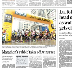 Something unprecedented happened yesterday: a rabbit won the Pittsburgh marathon yesterday. Okay, not an actual rabbit. The Tribune-Review says after 26-year-old Jeff Eggleston completed his job of pacing the race’s men (a job referred to as the “rabbit”) he managed to pass them all by mile twenty and win the race by 29 seconds. Said Eggleston: “I could hear these guys breathing and was like, ‘I’m sorry, I have to finish you off.’”