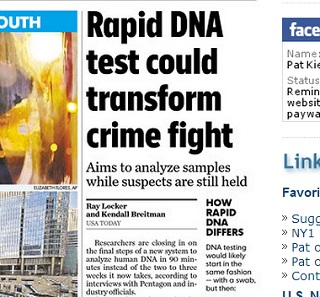 USA Today says researchers are on the cusp of producing a method for DNA testing that would yield results in 90 minutes, instead of the current two to three weeks. This would be a huge boost for law enforcement as officers would be able to analyze DNA while suspects are still being held. The tests could be done in the field - instead of at a lab, saving more time.