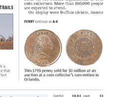 That was certainly worth a pretty penny. The Orlando Sentinel says a rare penny fetched $1 million at a recent coin show. The copper coin was minted in 1793, the first year the US produced its own coins.