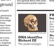 Richard III has been found. Scientists in the UK announced yesterday that they had positively identified the remains of the British monarch, nearly 500 years after his death. Scientists describe the skeleton as nearing intact and having a blow to the head and a curvature of the spine, an indication of scoliosis, which Richard is said to have had. Also his hands were crossed, which indicates that they may have been tied at the time of his death.