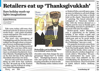 This year Thanksgiving falls on the first full day of Hanukkah. USA Today says that’s giving retailers all sorts of ideas. Store shelves are filling up with hybrid Thanksgiving/Hanukkah items from chocolate coins that say “Gobble Tov!” to Thanksgiving-themed menorahs. But you’d better enjoy it now. One physicist calculates the next time Thanksgiving and Hanukkah will overlap will be in 78,000 years.