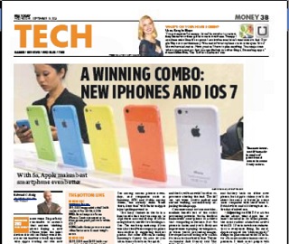 The reviews of the iPhone 5s and 5c are in - and all seem to be in alignment. David Pogue of the New York Times, says the age of annual mega leaps is over. But he praises the 5s’ fingerprint reader which he calls “genuinely awesome.” Pogue also gives high marks to the new LED flash, and the new operating system, ios7 that comes along with the phone. In the Wall Street Journal Walt Mossberg says after using the new fingerprint reader, he found it annoying to go back to typing in a password on his old phone. He also calls the iPhone 5c a nice option for newcomers and thrifty upgraders. USA Today‘s Ed Baig agrees about the scanner, the flash and ios7, though he does lament the lack of a slightly larger screen and stereo speakers.