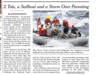 The New York Times says when Eric and Charlotte Kaufman were rescued from their disabled sailboat along with their 1 and 3 year-old daughters, it launched a debate over whether they were bad parents for embarking on such a journey or just unlucky. The family set out from Mexico for what was to be a month’s-long journey to New Zealand before running into trouble less than two weeks later.