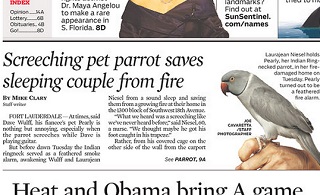 A Florida couple has Pearly the Parrot to thank for saving them from a fire in their Fort Lauderdale home. The South Florida Sun-Sentinel says the couple awoke to screeching they’d never heard before. They discovered a fire in the laundry room - and firefighters arrived within minutes to put it out.