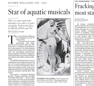 The LA Times has a front-page obituary for Hollywood icon Esther Williams in this morning’s paper. Williams, who was known for her “aqua musicals,” died yesterday at the age of 91. The paper harkens back to a sentence it wrote in 1984 to describe the screen legend’s pull on the American public: “Esther Williams did more for a bathing suit than John Wayne ever did for a cowboy hat, Tom Mix for a horse, Errol Flynn for a sword, Ronald Colman for a pith helmet or Cary Grant for a tuxedo.”