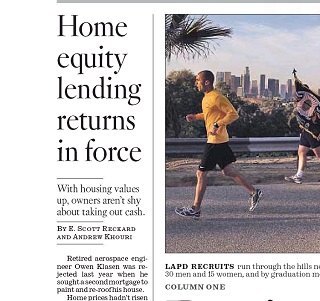 The Los Angeles Times says homeowners are once again borrowing against their homes, despite the costly lessons of the housing market collapse. Bank of America saw its home equity business surge 75% nationwide last year compared with 2012. The difference this time around is applicants who are getting approved have high credit scores, ample savings and equity in their homes.