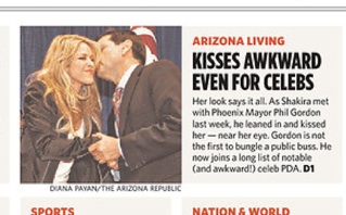 The Arizona Republic says there’s only one word to describe the Phoenix mayor’s attempt to plant a kiss on Shakira’s cheek late last week: awkward. The pop star was in town to voice her opposition to the state’s controversial new immigration law. When Mayor Phil Gordon leaned in to kiss her, Shakira “had the look of a 7-year-old being smooched by her Tia Lupe, the aunt whose kisses always left a mark.” In honor of the cumbersome canoodle, the paper recounts other acts of PDA that have made us cringe.