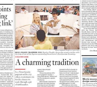 Forget twirling the baton. At the Miss Snake Charmer contest in Sweetwater, Texas, contestants are expected to not only impress the judges with their poise, but also wade through a pit full of rattlesnakes. And the competition doesn’t stop there. Before taking home the tiara, the would-be beauty queens are expected to “handle scores of serpents, often ‘milking’ or gathering their venom, and beheading and skinning them.” Oh, and then they eat some snake too.