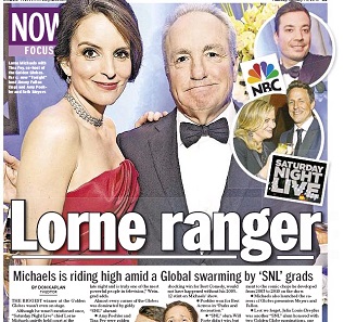 The Daily News says the Golden Globes helped confirm Saturday Night Live creator Lorne Michaels is atop the television universe. Michaels saw his alumni dominate the Globes, from hosts Tina Fey and Amy Poehler (who won a Best Actress award for Parks and Recreation) to Andy Samberg who got an unexpected win for Best Actor in a comedy for Brooklyn Nine-Nine. Michaels will also oversee the revamped Tonight Show when Jimmy Fallon takes over next month.
