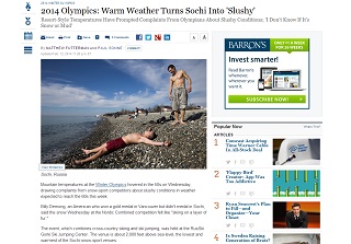 The Winter Games in Sochi are becoming known for their balmy temperatures. The Wall Street Journal puts it in perspective with a chart comparing the temperatures in Sochi to the temperatures during recent Winter Olympics. While the outdoor events are held outside of Sochi at elevation where it’s colder, athletes have still complained about the conditions.