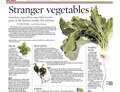 If you’re sick of eating peas and spinach, the Sun Sentinel has a guide to some of the stranger vegetables popping up at farmers markets this summer. You might want to try mizuna if you’re over arugula. It’s got the same peppery kick and is equally good raw or cooked. Breakfast radishes are another good addition to your greens routine. They are slightly floral, almost like an apple or pear, and taste great in a salad.