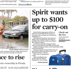 This is getting out of control. According to the front page of the Sun Sentinel, Spirit Airlines isn’t satisfied with its baggage fee. You’ll remember that Spirit is the airline that started charging for carry-on luggage last year. Well, starting in November, passengers will be charged $100 for the carry-on bags they want to store in overhead bins. Right now the fee is $45.