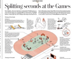 The Washington Post has a great graphic in this morning’s paper, explaining how exactly officials implement fraction-of-a-second timing during the Olympics. Track and swimming events have the most elaborate timing set-ups. It all starts once an athlete’s feet touch the starting blocks, which are designed to tell if they push off even a tenth of a second too early.