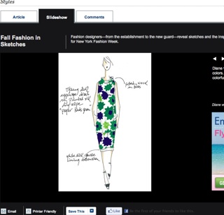 Bright colors. Conservative styles. That’s what you can expect to see on the runways at Fashion Week says the Wall Street Journal. Columnist Christina Binkley got her hands on a dozen drawings from the sketchpads of everyone from Diane von Furstenberg to Nanette Lepore, and gives a great sneak peak of what’s in store for the Spring 2012 season. Binkley says many designers are harnessing new dyeing technology that allows them to produce more “vibrant and saturated” colors. In terms of cut, expect to see higher necklines, below-the-knee skirts and in general, a more covered-up look.