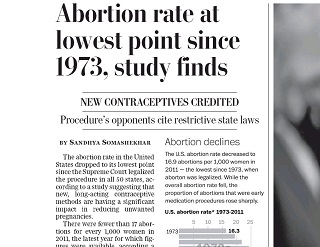 A new study finds the abortion rate in the United States has dropped to its lowest point since the Supreme Court legalized the procedure in all 50 states. The Washington Post says the study suggests long-acting contraception methods have had a significant impact in reducing the number of unwanted pregnancies. There were fewer than 17 abortions for every 1,000 women in 2011, the latest year for which figures were available.