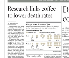 I’ve never been a coffee drinker, but maybe now’s a good time to start. A 14-year study found that coffee drinkers were less likely to die than their java-abstaining counterparts. The LA Times says the more you drink the better. Apparently, those who drank more than five cups a day had the lowest risk of death. Researchers say the main point of their study is not to turn everyone into coffee fanatics, but rather to rescue the drink’s reputation.