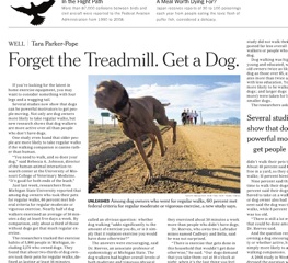 Your dog is good for your health. Tara Parker Pope’s column in the New York Times today makes the logical conclusion that, if you have an active pet you’re going to be more active too. Not only are dog owners more likely to takes walks, they are more likely to meet the federal government’s suggested amount of weekly exercise. Beyond just a trip to the curb and back, researchers found that dog owners are more likely to be active in every area of their lives—not just when nature calls to Fido.