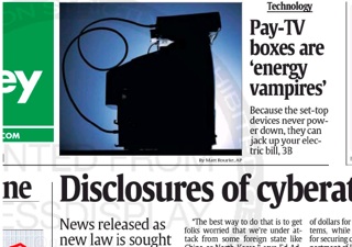 There’s a pretty stunning power usage calculation in USA Today this morning. You know those TV set-top boxes? Well, according to a new study, two cable boxes use about the same amount of energy needed to power an Energystar refrigerator. The typical cable box or satellite receiver uses 171 kilowatt hours of power per year. More shocking still is that two-thirds of that energy (the paper says the “equivalent annual energy output of six coal-burning power plants”) is used even when the box is switched off. The study also praised cellphone companies for making models that conserve energy while not in use, suggesting they be used as an example to emulate.