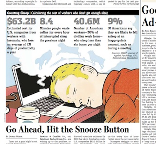 The Wall Street Journal makes a case for hitting the snooze button in this morning’s paper. Harvard Medical School researchers have concluded that one-third of Americans don’t get enough sleep, which translates into billions of dollars in lost productivity. Specifically, about $63.2 billion is lost annually due to something called “presenteeism,” people showing up for work when they are sleep-deprived. A separate study found that workers waste about 8.4 minutes per hour of interrupted sleep.
