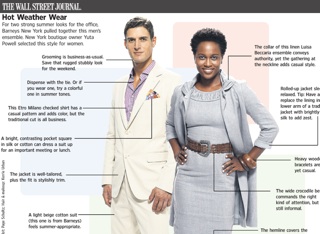 The thought of donning a full suit in this warm summer weather makes me grateful I wake before the sun does. The Wall Street Journal says the heat is no reason to wear something you’d wear to the beach, to the office. Instead, consider mixing traditional cuts with more casual elements, like a bit more color than you’d wear in the winter. Or add some funky jewelry to dress up a boring suit. The Journal asks two experts to design an ideal summer work outfit, one for men and one for women.