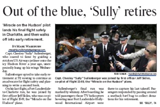 Captain Sully is hanging up his wings. Chesley “Sully” Sullenberger has decided to retire early. The “Hero on the Hudson” pilot says he will continue advocating for flight safety and plans to write another book. Sounds like he’ll need the money. The Charlotte Observer says passengers on Sullenberger’s last flight yesterday passed around a barf bag to collect donations for his retirement. And all he got was a measly $11.