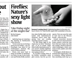Think you’ve seen more fireflies than normal this year? You’re right. “It’s like Friday night at the singles bar out there,” says an entomologist interviewed by USA Today. Apparently, it’s something about the combination of warm and wet weather that tends to bring out the fireflies.  If you were under the impression that the light show you’ve been enjoying since childhood is a PG-affair, think again. In a word, it’s all about mating. The fireflies lighting up your lawn are probably males trying to attract a willing female, who will only flash back when she sees a “male they find particularly attractive.”