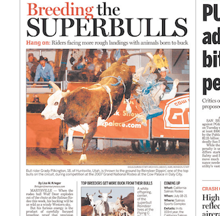 The San Jose Mercury News says a new generation of “superbulls” has taken the competition out of the modern rodeo. So few riders can stay on the animals long enough to even score a point that when one does, it’s considered a huge feat. In 1995, about half of professional riders (46 percent) made it to the eight-second bell. In 2013 that number slid to about 27 percent. So where do these superbulls come from? They’re carefully bred from the best breeding bulls on the market, which command $2,000 for a tablespoon-size “straw” of semen.