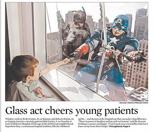 In what’s becoming a semi-annual tradition, window washers at the Ann & Robert H. Lurie Children’s Hospital of Chicago donned superhero costumes yesterday. The Chicago Tribune says Batman, Captain America and Spider-Man descended from the roof, stopping to interact with the young patients. They posed for photos and fist bumps, hoping to lift the spirits of those undergoing treatment for cancer or other serious disorders.