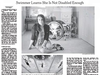 The New York Times says American swimmer Victoria Arlen’s Paralympic career is in jeopardy, because she is not disabled enough. Arlen suffers from the neurological condition transverse myelitis that has rendered her legs paralyzed. But the International Paralympic Committee ruled her ineligible to compete in the world championships last month because there’s a chance, according to her doctor, that her condition may one day improve. Arlen says it’s beyond sad to be penalized for having a glimmer of hope that she may one day be able to walk again.