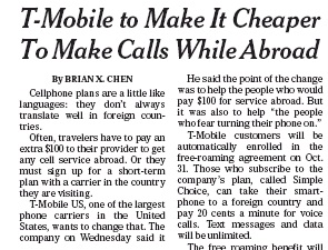T-Mobile’s latest move to distinguish itself from the other major US mobile phone carriers will be welcome news to international travelers. Customers will get free unlimited international data and texting and voice calls made overseas would cost just 20 cents a minute. The New York Times says T-Mobile expects an increase in customers to make up for the money lost by not charging roaming fees.
