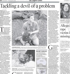 When ‘devil’ is your last name, I imagine it’s hard to get folks to like you. That’s the problem plaguing the Tasmanian devil says LA Times. That and a rare infectious cancer threatening to wipe out the entire species have prompted Australian scientists to start a PR campaign to make the rodent, described as “a skunk, with the jaws of an alligator and the charm of a weasel,” more loveable. The task, however, is no simple one: “From a marketing standpoint, the Tasmanian devil is no koala.”