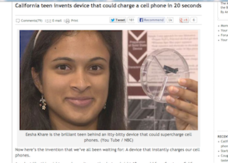 A California teen has invented a “super-charger” that will re-power your cell phone in 20 seconds flat. 18-year-old Eesha Khare says her invention works by packing more energy into a small space, delivering that charge to its source faster and then holding it for longer. The San Francisco Chronicle says Khare’s breakthrough could be used to power everything from phones to car batteries.