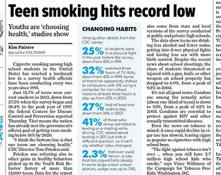 Teen smoking is on the decline. Just 15.7% of U.S. high school teenagers were smokers in 2013 - that’s down from 27.5% when officials began tracking teen smoking rates in 1991 and down from a peak of 36.4% in 1997. The Centers for Disease Control and Prevention survey also finds teens are drinking less alcohol and fewer sodas, getting into fewer physical fights and having less sex with more birth control.
