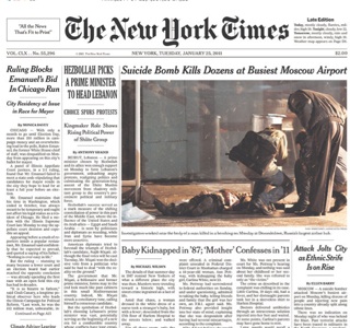 A terror attack at Moscow’s busiest airport yesterday killed more than thirty people and left Russia shaken reports the New York Times this morning. Apparently the work of a suicide bomber, the blast “inflicted a deep injury on Moscow’s image just as President Dmitri A. Medvedev prepared to woo foreign investors at the World Economic Forum in Davos, Switzerland.” No one has come forward to claim responsibility as of yet, but the Times says the fragile relationship between Russia’s ethnic groups will likely be tested in the coming weeks as facts emerge from the smoke.