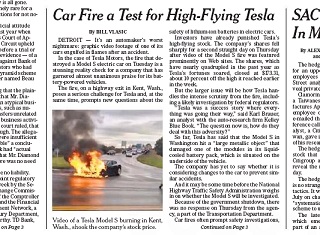 Tesla Motors is dealing with some PR trouble - after video of one of its cars, engulfed in flames after an accident, made the rounds on the internet. The New York Times says the fire in the Model S electric car is a reality check for a company that received near-unanimous praise for its vehicles. The fire is likely to result in a federal investigation and questions are being raised about the stability of lithium-ion batteries in the event of a crash.