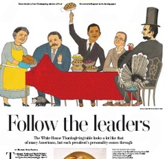 Very cool pre-Thanksgiving article in the Washington Post this morning. The paper takes a look at how the holiday has been celebrated by residents of 1600 Pennsylvania Drive in years—and centuries—past. William Taft apparently served “chubby Georgia possums” alongside his Thanksgiving turkey, and FDR loved oyster stew and browned sausages.