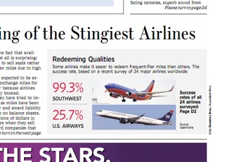 If you’re sitting on a pile of frequent flier miles, I hope they’re on Southwest. The Wall Street Journal says 99.3 percent of the time you can find an awards seat on the airline’s flights, making it the best domestic option. US Airways and Delta bring up the rear in the rankings. Both offered redeemable seats on a given flight less than 28 percent of the time. JetBlue and United also did well, placing in the high and low 70 percentiles, respectively. Overall, it’s easier to get frequent flier miles on low-cost carriers compared to the big ones with large international networks because smaller carriers don’t have the credit card tie-ins that big carriers do; last year American said 62 percent of the frequent flier miles it issued went to credit card holders, not people who’d actually flown.