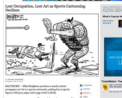 The New York Times laments the death of the sports cartoon in today’s paper. Back in the day, sports cartoons were thought of as a separate form of journalism, combining the “skills of a caricaturist and the mind-set of a columnist.” But writer Richard Sandomir says newspapers just aren’t willing to pay for them anymore.