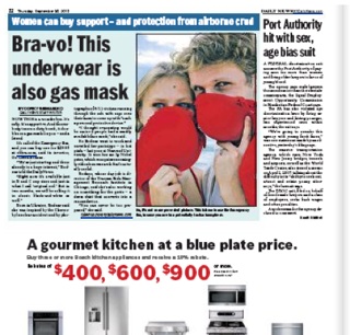 I can hear the announcement now: “In case of emergency, please remove your bra…” The New York Daily News takes a look at a new bra that doubles as a gas mask. Actually, it turns into two masks—just take it off and strap one cup to your face and the other to a braless friend in distress.