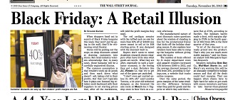 The Wall Street Journal has an interesting piece on how those Black Friday deals are engineered by retailers. For example, the sweater on sale for $39.99 was probably never meant to sell at its “full” price of $68. So your 40% savings was built-in in the first place. Some companies are facing lawsuits for raising prices before Black Friday so they can discount them for the holidaysn.
