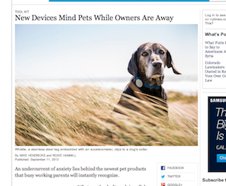 The New York Times has a good run-down of a new crop of pet tech objects on the market these days. At one end of the spectrum there’s Whistle, an accelerometer you clip to your dog’s collar, which registers its every move. And then there’s something called the PASSport Pet Access Smart System, which, thanks to radio frequencies, allows “up to 20 animals to have unique time restrictions for going in and out of the house.” For overweight pets, there’s a whole host of treadmills to choose from, and even a feeding device that makes your cat work for its food.