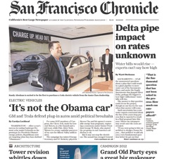 “It’s not the Obama car” declares the front page of the San Francisco Chronicle this morning. Usually, a presidential stamp of approval is a good thing. But not in the electric car game. GM and Tesla are trying to get out from under a smear campaign Republicans have launched against the electric car, reminding the public that what they’re making are cars, not “political issues.”