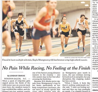 The New York Times introduces us to 18-year-old Kayla Montgomery, one of the fastest young distance runners in the country. Kayla has multiple sclerosis. The disease blocks nerve signals from her legs to her brain, so she cannot feel pain. The disease also causes her legs to go numb, but as soon as she stops running, she loses control and falls, collapsing after every race.