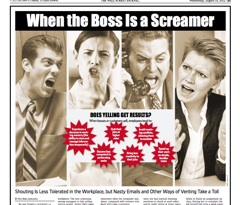 Where is the belligerent boss? According to the Wall Street Journal, “the yelling boss appears to be quietly disappearing from the workplace.” But just in case your boss hasn’t received the memo, the Journal has several tips for dealing with an “office screamer”: don’t be the first to react, try to listen and if things get bad, call in a mediator.